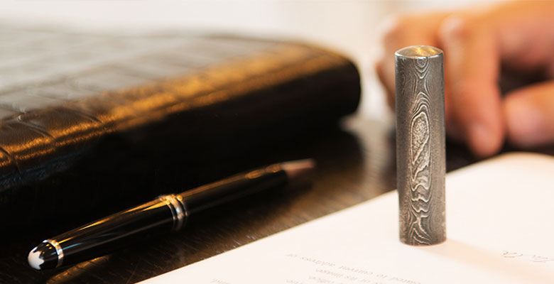 gene(ジェーネ)ダマスカス模様に彩られた、神秘性と重量感に溢れる、 金属製高級印鑑「ジェーネ」の販売を行っています。